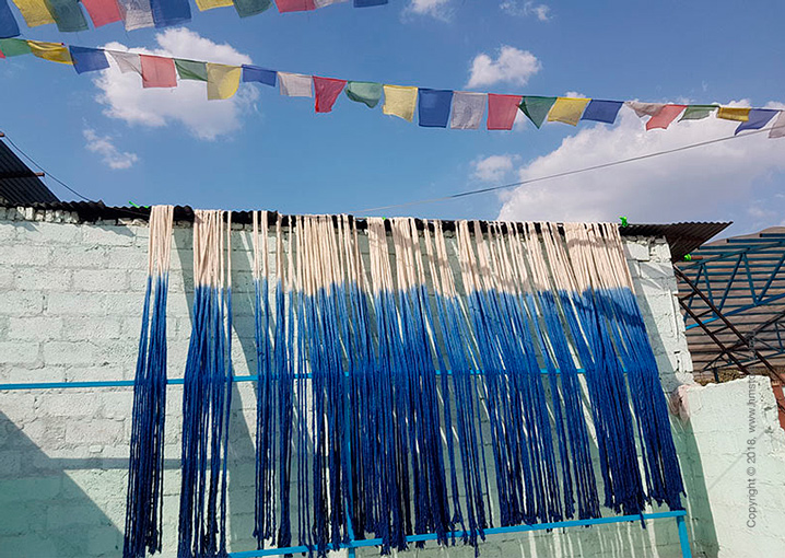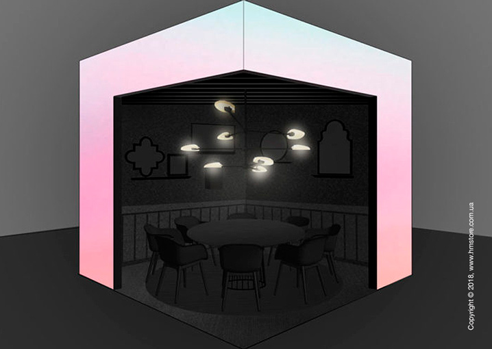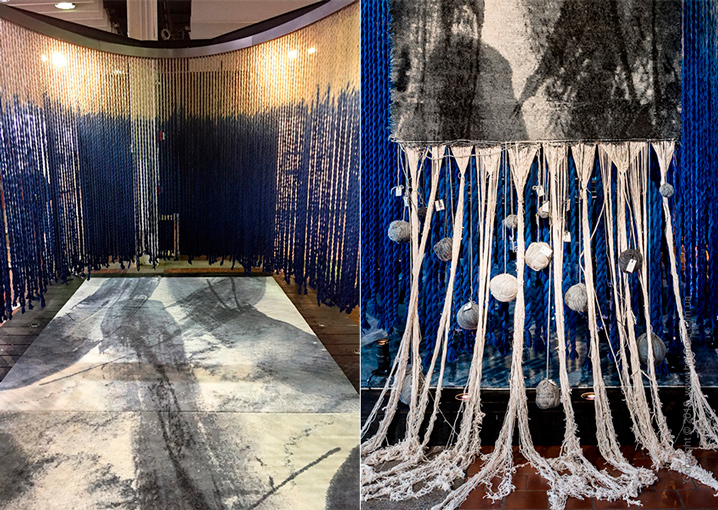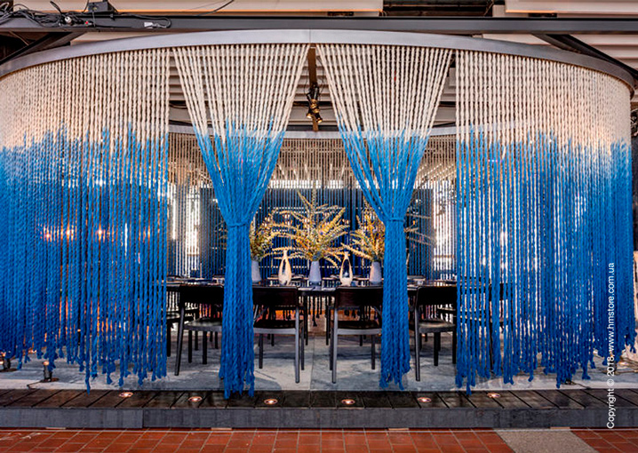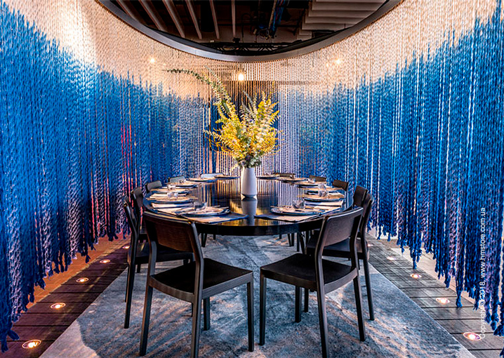 Проектные записки. Эта обеденная зона делает ударение на мастерстве, процессе создания и сотрудничестве. На полу можно увидеть два ковра «Lola», а слева – часть самого процесса плетения этого ковра. Незаконченный кусок демонстрирует клубки и инструменты. Вокруг сделанного под заказ, эллиптического стола можно увидеть 400 веревок, окрашенных вручную и подвешенных на специальную деревянную структуру. Эти веревки были сплетены в Непале и создают необычные эффект.