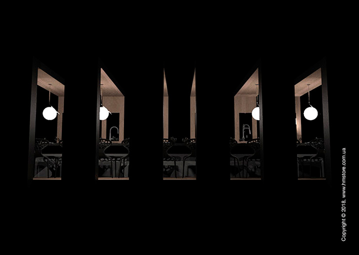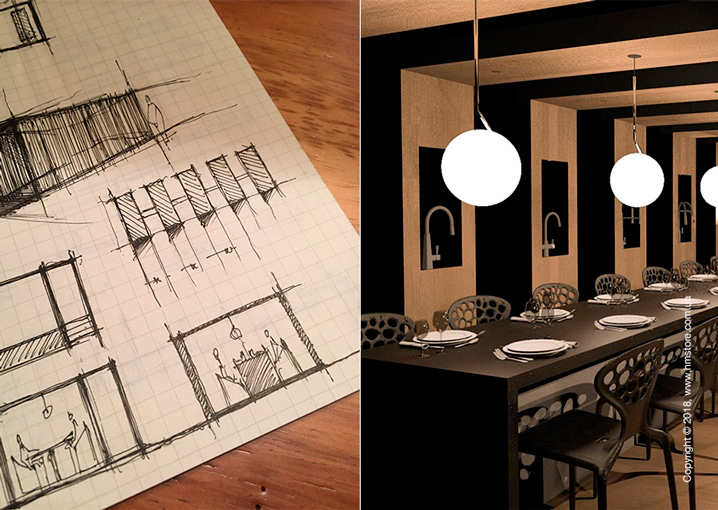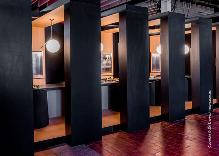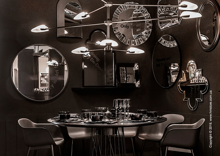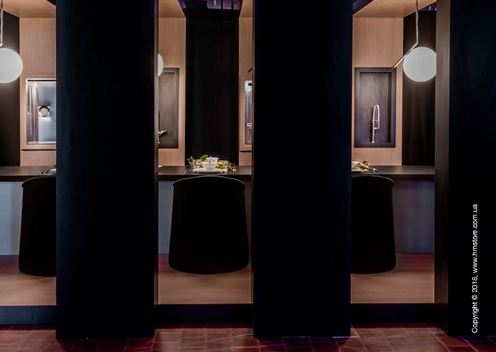 Черный интерьер был выбран специально, чтобы ничего не отвлекало от обеда. Стол, созданный совместно с «MASHstudios» стоит на покрытии для пола от «Bolon». Стены были обшиты фетром «BuzziSkin», который добавляет объемности, текстуры и звукоизоляции. «BuzziSpace» также предоставили полки «BuzziPlank» и зеркала «BuzziMirage». Помещение освещается люстрой «Rich Brilliant Willing Pilot», также выполненной в черном матовом цвете. Обеденную зону дополняют кресла от «muuto», предоставленные «ORI». Экстерьер и графические отражения на зеркалах были созданы «Drive21», а структура обеденной зоны была построена и собрана «Qwest Contracting».