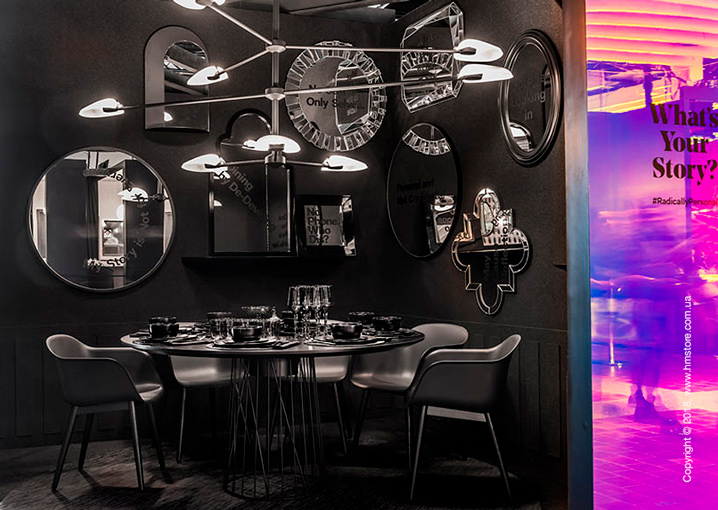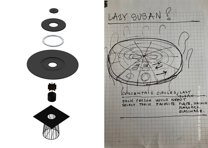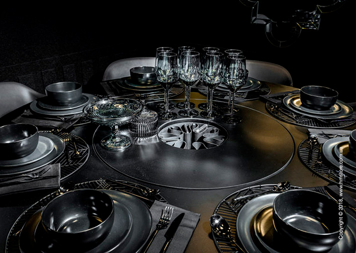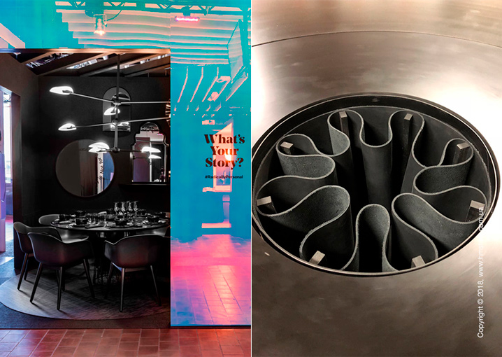 В 2018 году «Rapt Studio» впервые принимала участие в «Dining By Design». Они сфокусировались на том, чего всем нам сегодня не хватает – связи между людьми. Их обеденный стол не имеет никаких девайсов, он поощряет людей наслаждаться компанией друг друга, рассказывать истории, отложив смартфоны в специальный отсек, расположенный в центре вращающейся столешницы. Эта обеденная зона отличается полностью черным интерьером и ярким,переливчатым экстерьером.