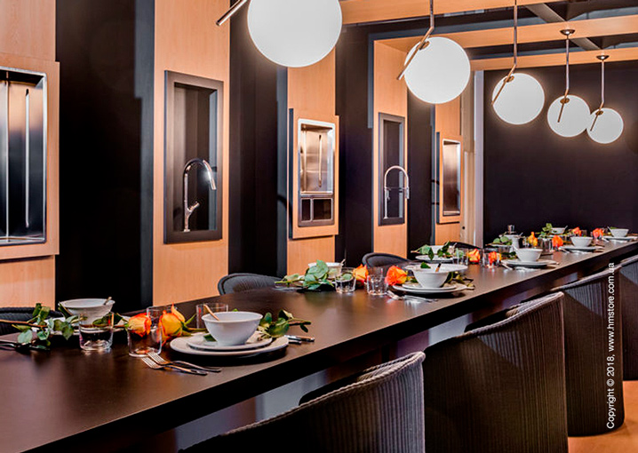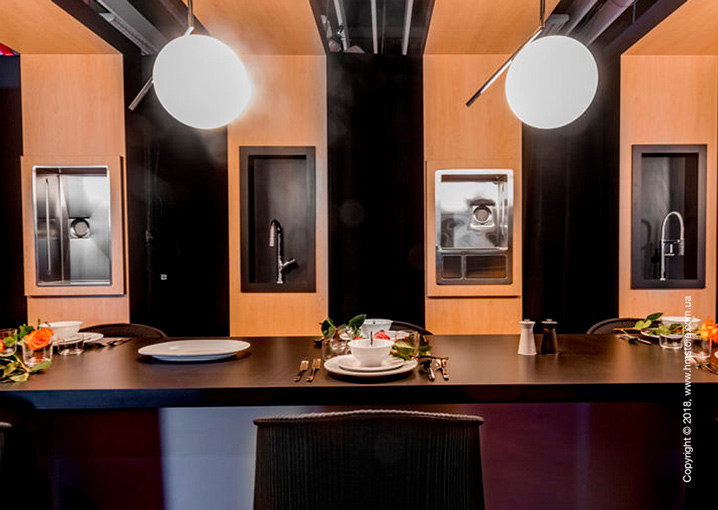 Проектные записки. В этой обеденной зоне соединяется два гиганта – дизайнер Marc Thorpe и всемирно известный производитель раковин и кранов «Franke». Гости смогут наслаждаться обедом, окруженные продукцией «Franke», выставленной в виде произведений искусства. Здесь можно увидеть раковины «Crystal», «Franke Chef Center», «Peak», «Professional 2.0», «Pescara» и «Cube», а также краны «Pescara», «Cube», «Absinthe», «Steel» и «Fluence».