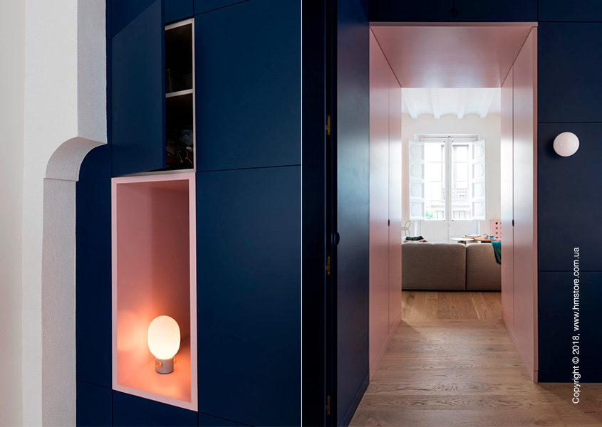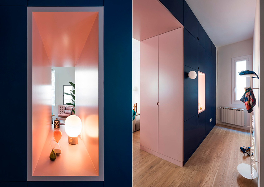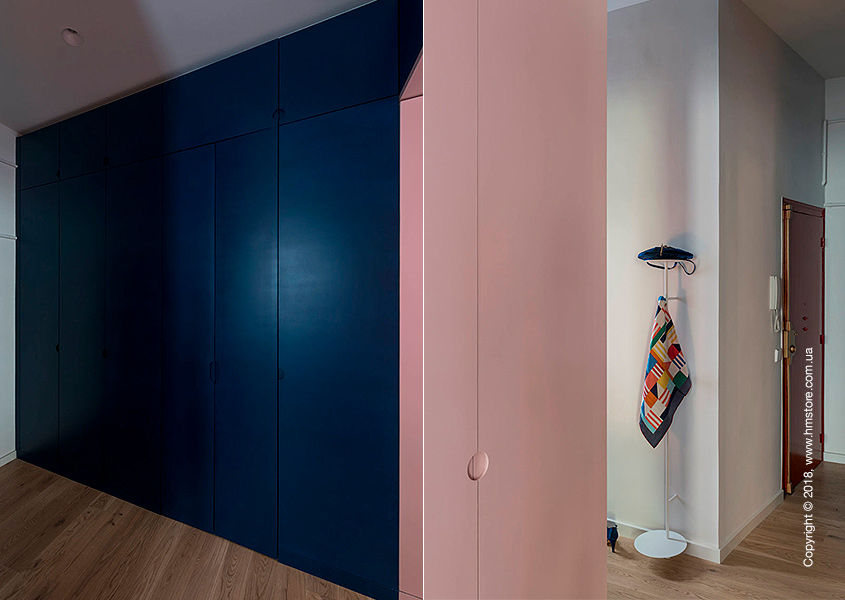 Массивная перегородка, используемая для хранения, отделяет коридор от гостиной. Она отличается синими дверцами и розовой отделкой внутри.