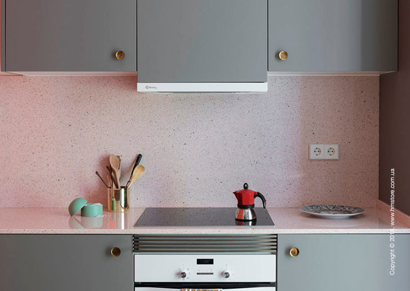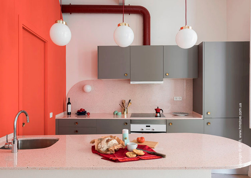 Открытая кухня включает закругленный остров и шкафчики серого цвета, которые соединяются с яркой коралловой стеной, скрывающей туалетную комнату.