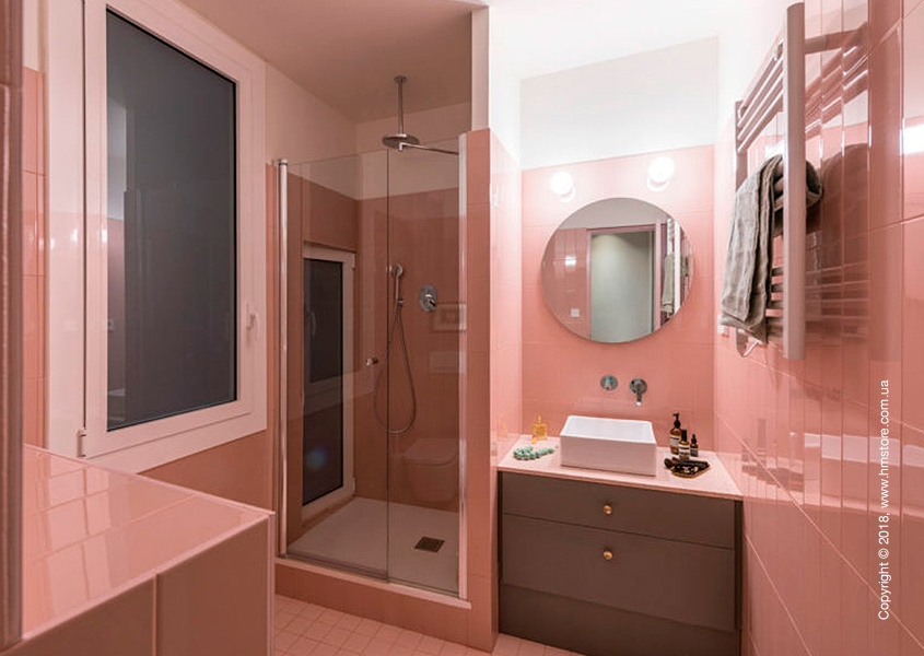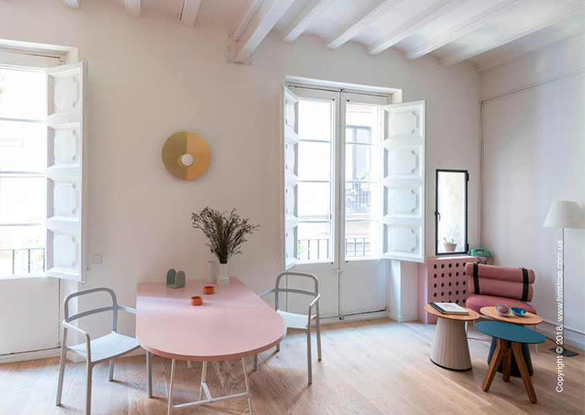 Оттенки розового можно заметить по всему интерьеру, включая зону отдыха с креслом «Roll Club Chair» от «Kettal».