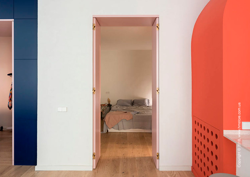 Спальня прячется за светло-розовой дверью, и попасть в нее можно прямо из гостиной.