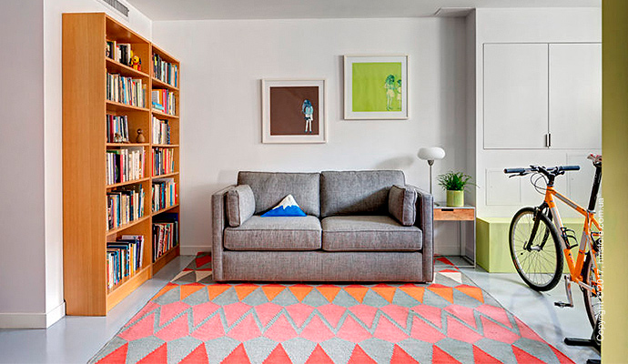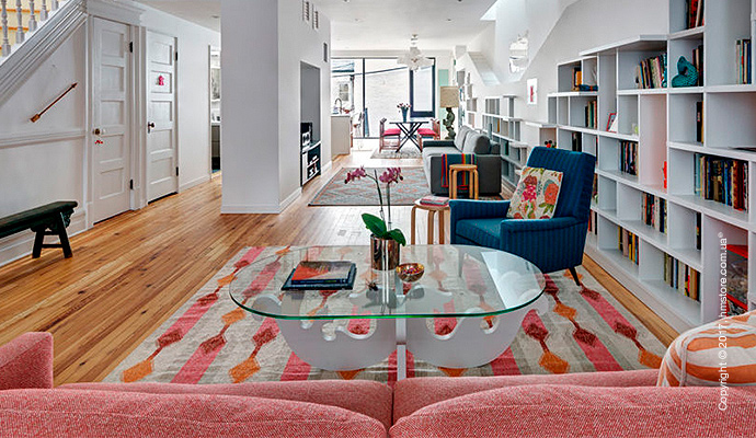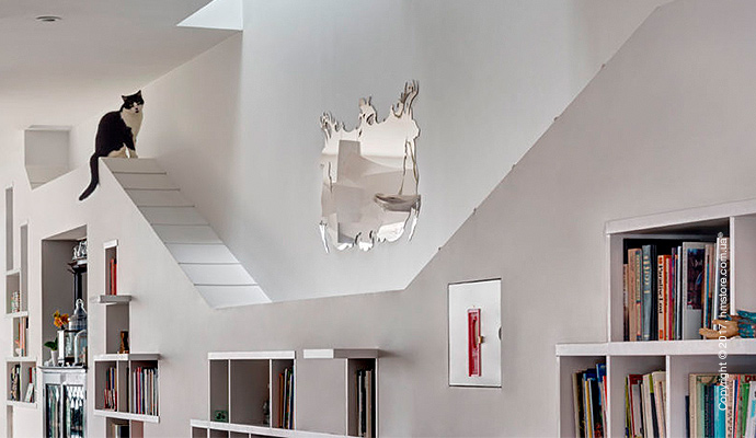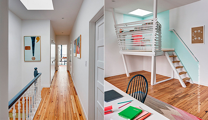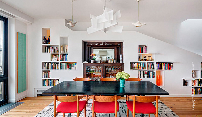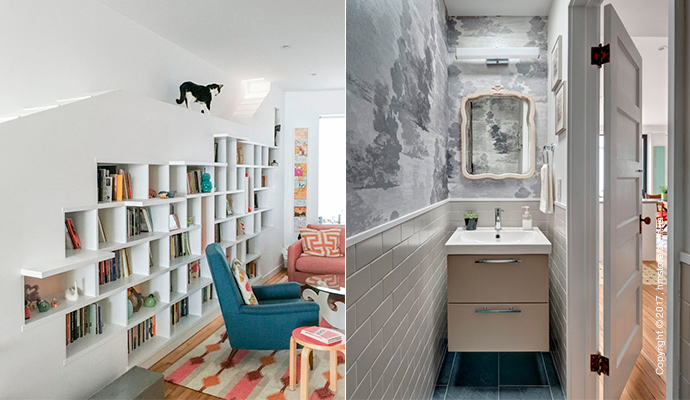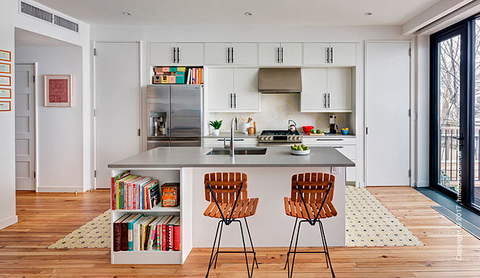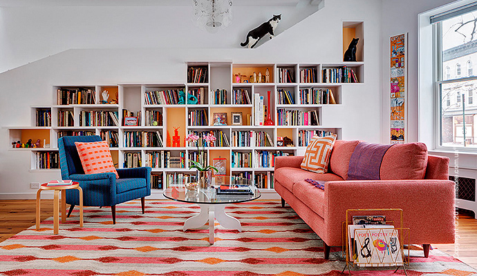 Когда двое любителей книг с двумя котами решили обновить свой новый таунхаус в Бруклине, они наняли студию «BFDO Architects», чтобы воплотить в жизнь свою мечту. Они хотели иметь дом, который имел бы оригинальное сочетание цветов и света, и, в то же время, чтобы у каждого было место для работы. Главных требований было два: возможность демонстрировать свою огромную коллекцию книг и возможность их скромным котам гулять и прятаться.