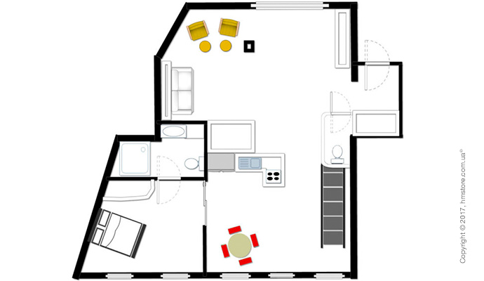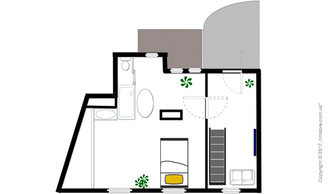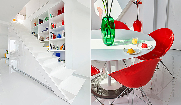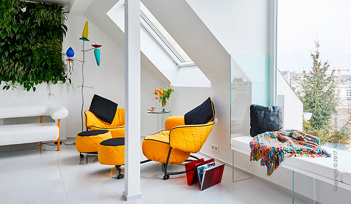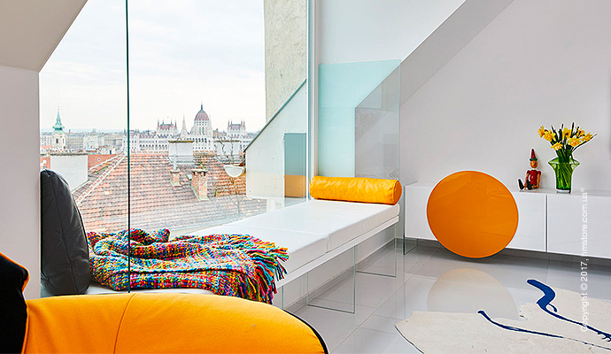 Белые поверхности и белые полы идеально сочетаются с огромными окнами, делая помещение очень светлым. Отобранная коллекция красочной мебели представлена по всему дому и создает яркую и игривую атмосферу. Желтые кресла 1980-х годов расположены на белом коврике, выполненном в виде карты Будапешта, с синим акцентом, отображающим р. Дунай.