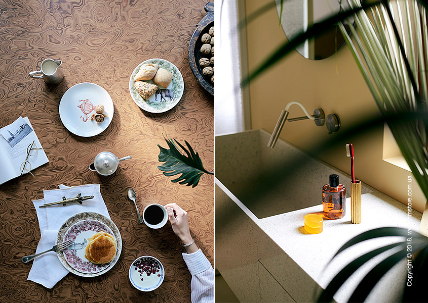 Оригинальный обеденный стол из дерева и латуни является одним из общих мест, наряду с кухней. Для гостей можно организовать такие оригинальные услуги, как кулинарные уроки, семинары на тему еды, дегустацию вин, приготовление еды с шеф-поваром, посещение местного рынка и магазинов и даже индивидуальный пошив обуви.