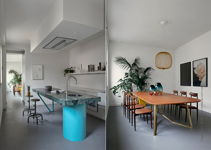 Интерьер квартиры напоминает лагуну, а каждая комната отличается собственной цветовой палитрой, включающей детали из светло-розового, голубого, желтого или зеленого цветов. Современная мебель создает в квартире свежую, современную атмосферу, а домашний декор и фотографии на стенах делают ее уникальной.