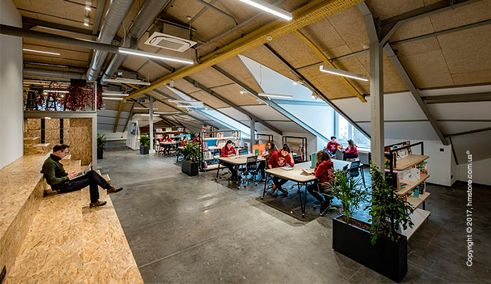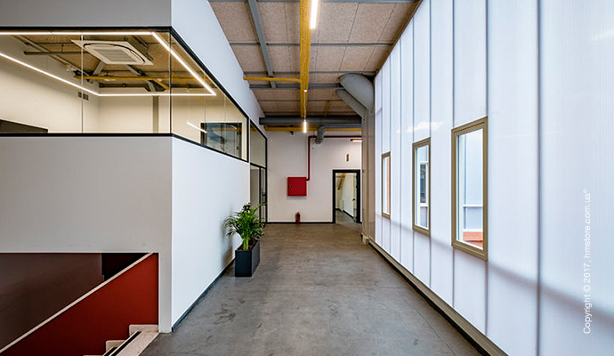 Потолок выложен панелями из дерева и шерсти, которые помогают контролировать шум и увеличивать экономию энергии.