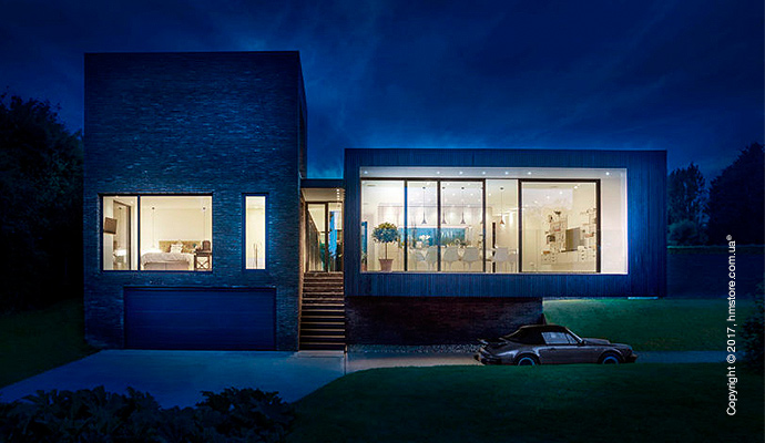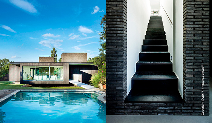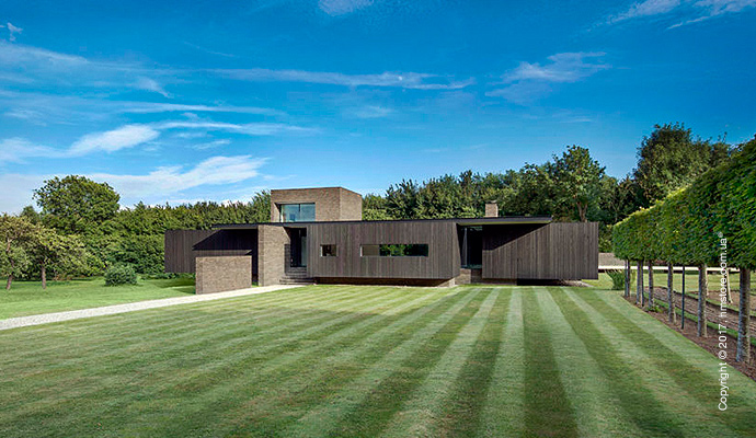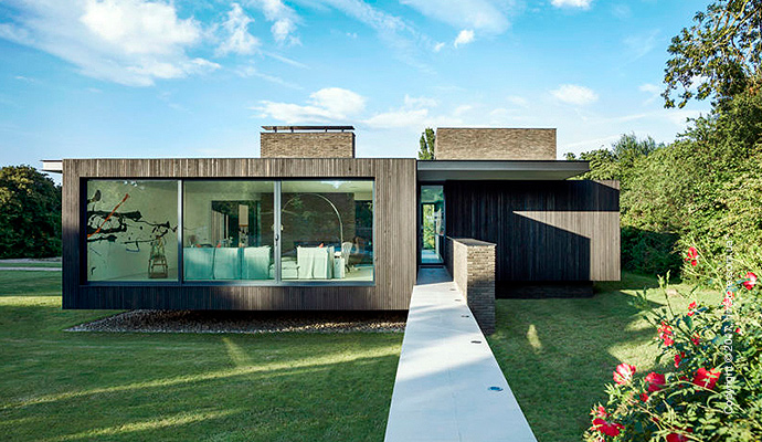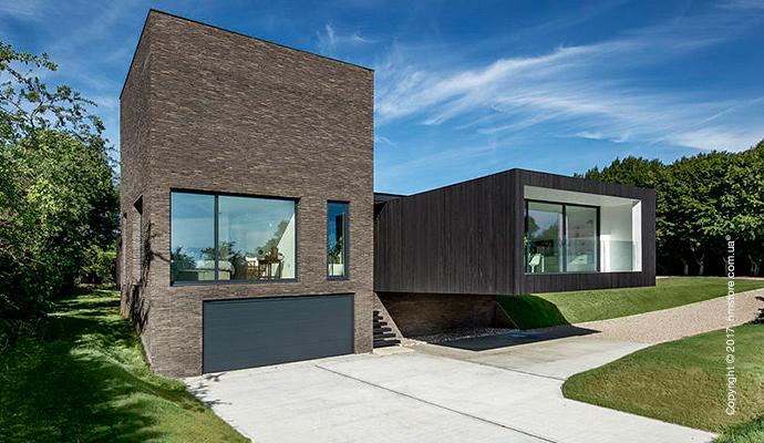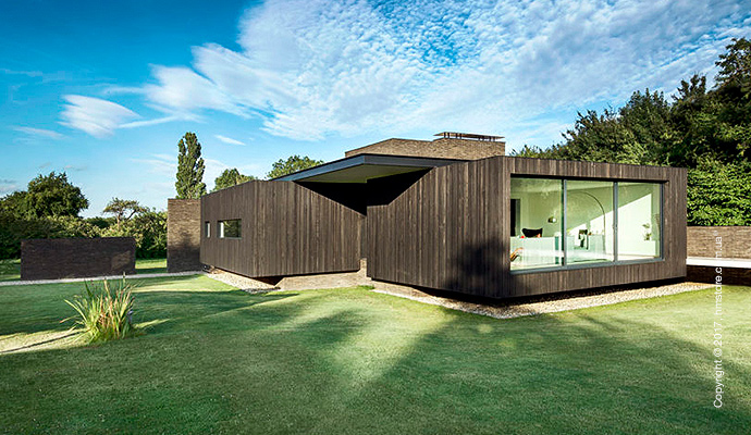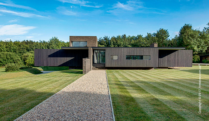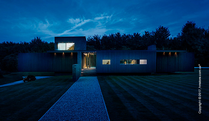 Снаружи дом выложен вертикальными деревянными планками черного цвета. Блоки соединены вместе так, что создается впечатление пересечения всего дома. Кроме того, в доме есть три входа, которые совпадают с осями постройки.