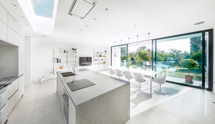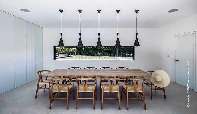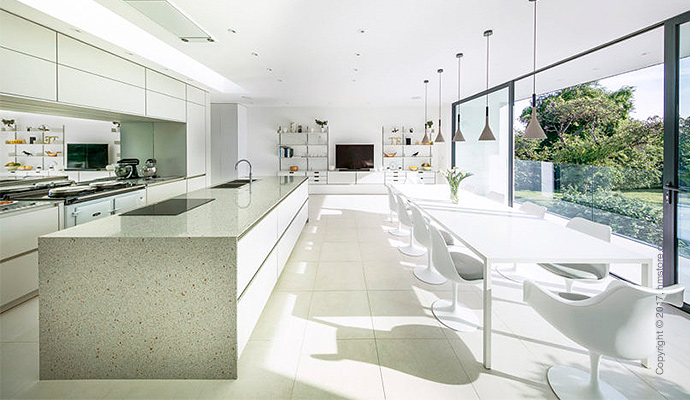 Гостиная выходит на бассейн, расположенный в западной части дома, а кухня и столовая «смотрят» на восток, благодаря чему они наполнены светом утреннего солнца. Комнаты имеют панорамные раздвижные стеклянные двери от пола до потока, из которых открываются виды на фруктовый сад и виноградник.