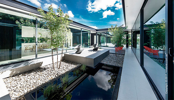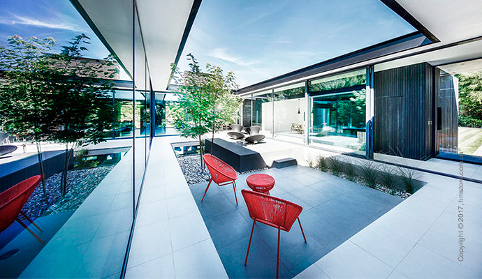 Прямоугольная форма дома была разделена на блоки, которые в свою очередь были отделены друг от друга, чтобы образовать центральный двор и чтобы каждый из них «фокусировался» на определенном аспекте сада. Кроме того, был добавлен дополнительный блок сверху, откуда открываются великолепные виды.
