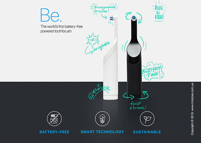 Посчитайте, сколько вещей вы используете, которые требуют батарейки. А теперь умножим это число на количество людей во всем мире. А теперь представьте, что только 1% использованных батареек люди отдают в переработку, а остальные просто выбрасываются, загрязняя окружающую среду. Одним из таких предметов, требующих батарейки, является зубная щетка. «Be.» предлагает вам решение. Эта зубная щетка не содержит моторов, не требует батареек и электрики.