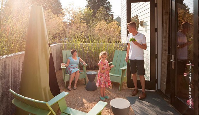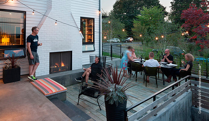 То, что обычно находится на задних дворах домов, в этом доме было перенесено на боковую террасу, которая находится на возвышенности над уровнем улицы, что добавляет ей приватности.