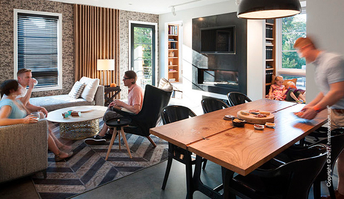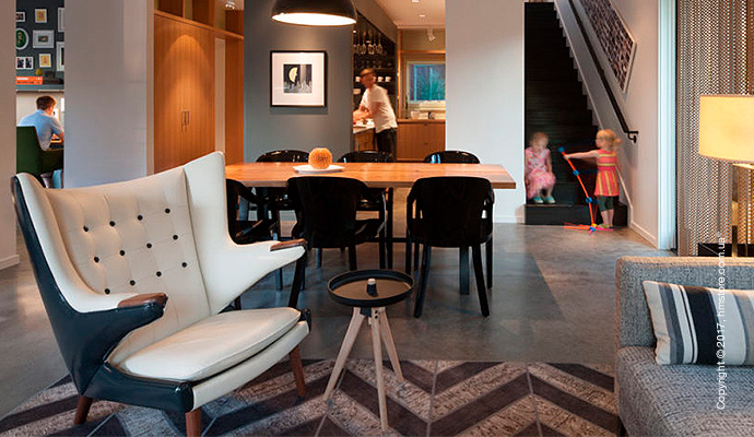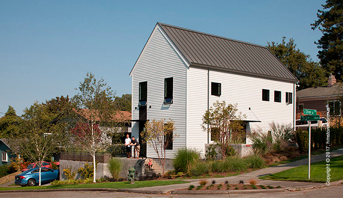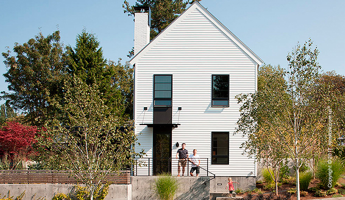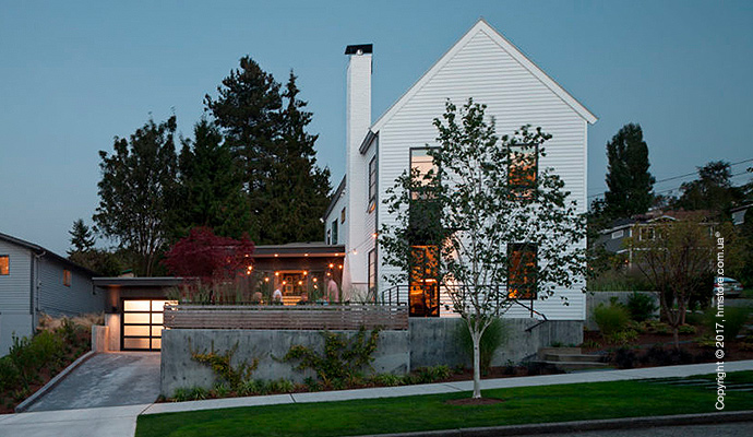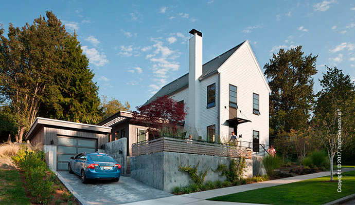 Спроектированный студией «SkB Architects» для растущей семьи в Сиэтле, дом «The ToDD Residence» был построен на угловом участке земли с ограниченным пространством и таким же бюджетом. Дизайн дома является городским вариантом двухэтажного фермерского дома со скатной крышей, который пристроен к одноэтажному «корпусу» с плоской крышей. Экстерьер дома отличается контрастной цветовой гаммой серого и белого, простыми формами и отсутствием ненужных деталей.