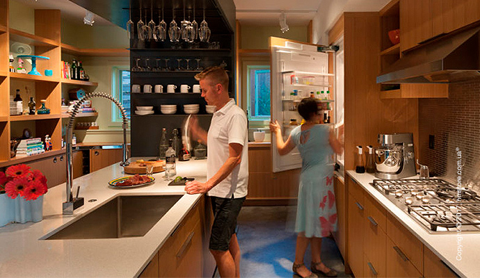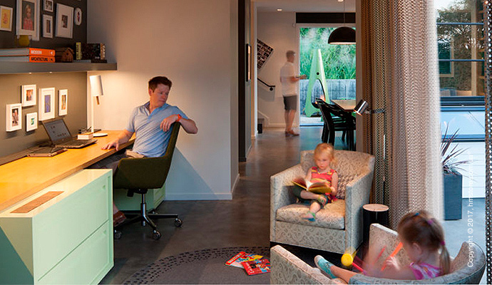 Площадь дома – 183кв.м. – была тщательно продумана, чтобы максимально использовать каждый доступный сантиметр. На первом этаже можно увидеть открытую планировку везде, кроме гостевой комнаты. Здесь расположена гостиная, столовая, кухня и кабинет.