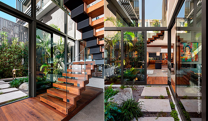Другим важным моментом была приватность, поскольку очень близко находятся соседи. Для этого было решено разделить главные части дома с помощью внутренних двориков.