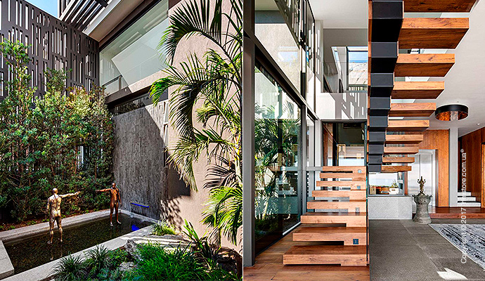 Сразу за лестницей находится уединенный двор с элементом водного дизайна и множеством зелени.
