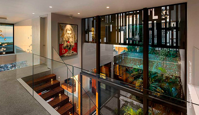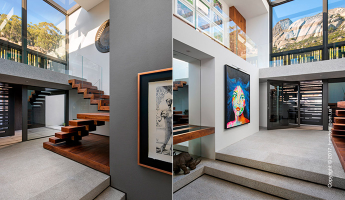 Главная лестница заключена в стеклянное пространство, ведущее прямо до крыши, а из огромных окон открываются виды на гору.