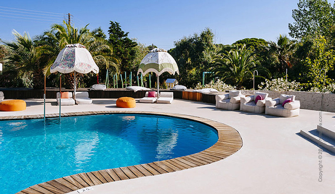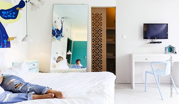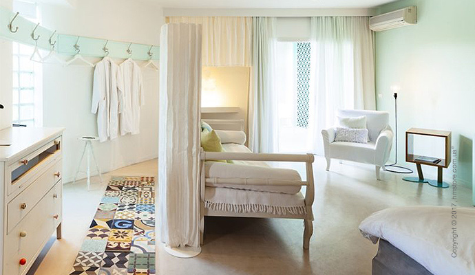 Стены некоторых номеров украшают иллюстрации и надписи из басен греческого поэта Эзопа. Всего в отеле 69 номеров с видом на море или сад. Каждый из них имеет уникальное цветовое оформление и декорации.