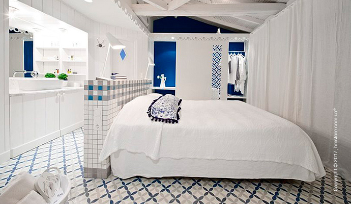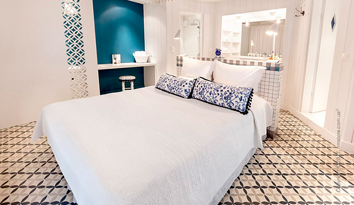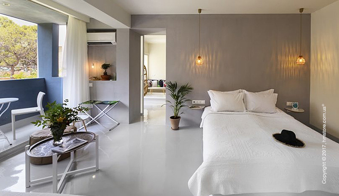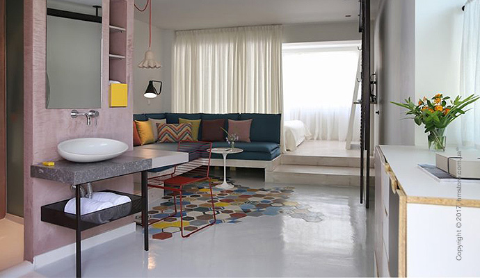 Синие элементы на стенах и плитке отражают воду Эгейского моря, которое находится всего в нескольких шагах от отеля.
