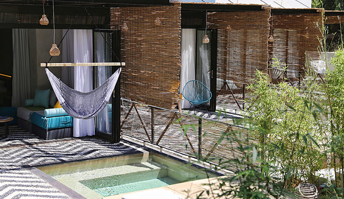В номерах можно увидеть удобные зоны отдыха, гамаки и персональные бассейны.