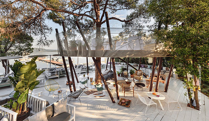 Расположенный на райской береговой линии на Халкидики (Греция), отель «Ekies All Senses Resort» имеет 10 эко-роскошных номеров, которые поощряют детей свободно бегать и исследовать, и этим же могут заниматься и взрослые. Новые номера «Pine» и «Evergreen» спроектированные афинской архитекторской фирмой «Agarch+», кажется, сливаются с пышным пейзажем с разнообразной флорой и фауной. Материалы и декор в номерах (например, каменный пол с узором «елочка») являются отсылкой к традиционному греческому мастерству и отлично сочетаются с современной мебелью.