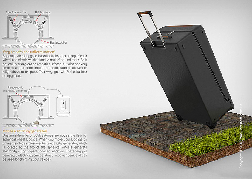 Элегантный дизайн не просто роскошный, но и отличается характеристиками – плавный ход, ударостойкость и противовибрационный механизм в колесиках. Кроме того, «Spherical Wheel Luggage» имеет встроенный пьезоэлектрический генератор, который образовывает энергию от вынужденных колебаний багажа. Эта энергия направляется во встроенное зарядное устройство, которое можно использовать для подзарядки ваших девайсов. Поэтому, любая пробежка по аэропорту будет означать еще больше энергии для вашего смартфона.