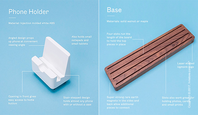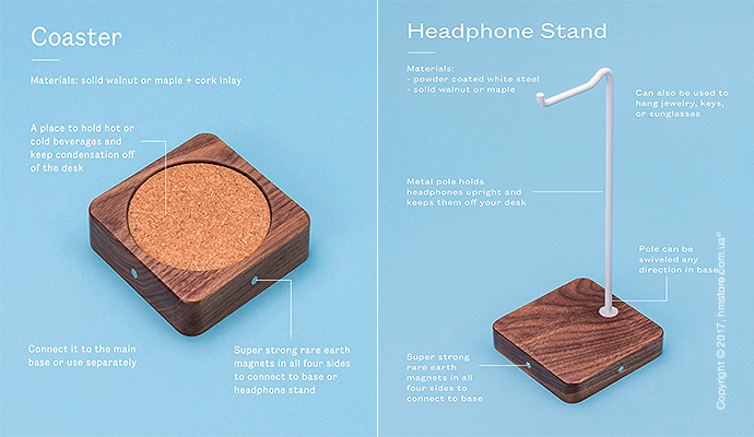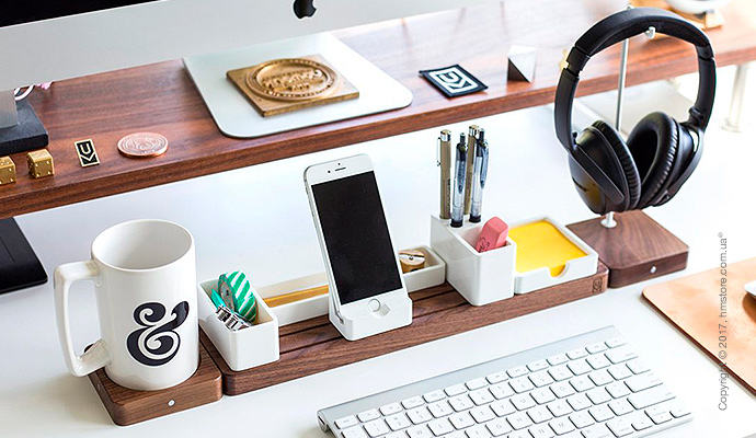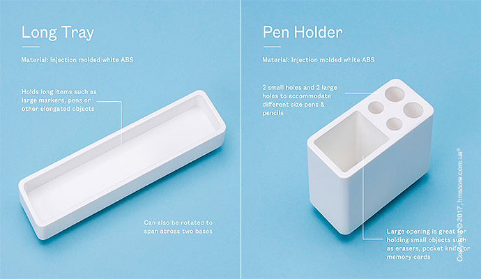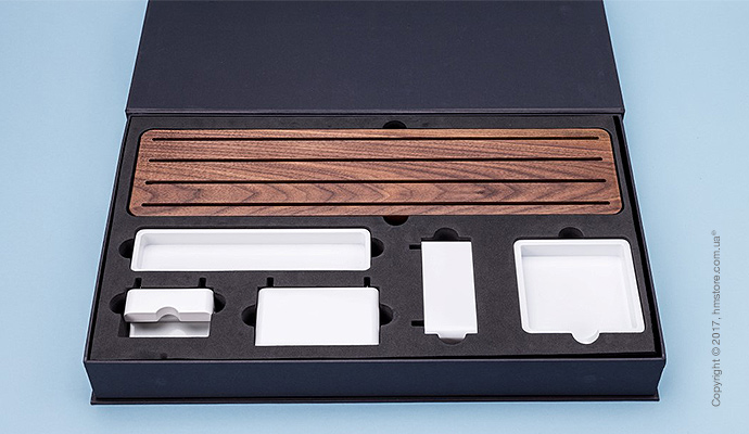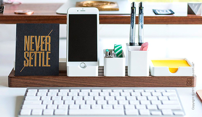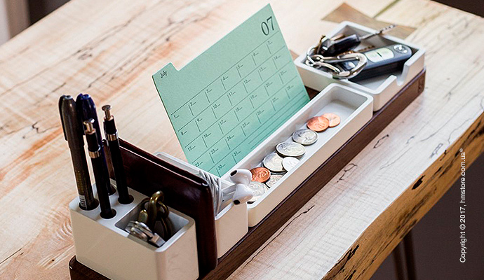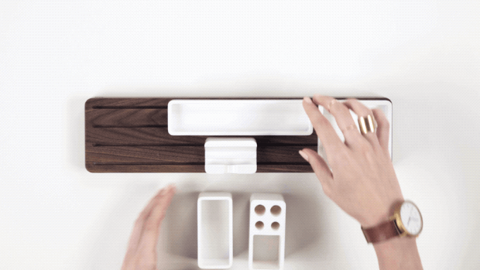 Дизайнер хотел создать органайзер, который подойдет всем, учитывая, что все мы разные. Самое главное в «Gather» – это порядок и минимализм. Этот органайзер доступен в двух вариантах древесины – орех (который гармонично контрастирует со светлыми столами) и светлый клен (который отлично выделяется на темных столах). В базовую комплектацию входит основание и аксессуары, а дополнительно можно приобрести две подставки.