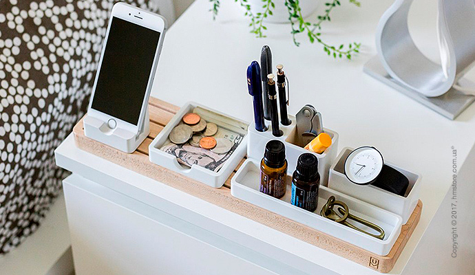 «Gather» – это органайзер, выполненный в стиле минимализма. Каждая его деталь имеет свое место и цель. Благодаря этому вы сможете навести порядок на столе в соответствии со своими потребностями и доступным местом. Основой «Gather» является деревянный поднос с отверстиями, куда можно поставить множество различных подставок. Вы можете добавлять новые или заменять одни подставки другими, или даже двигать их по основанию, приводя в нужный порядок так, чтобы все необходимое всегда было под рукой. Деревянное основание идет с двумя дополнительными аксессуарами – подставкой для напитков и держателем для наушников. Возможности комбинировать просто бесконечны!