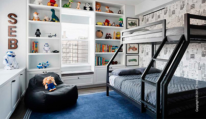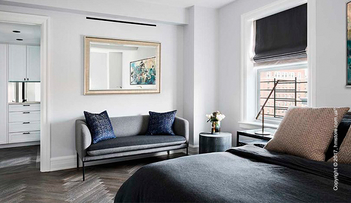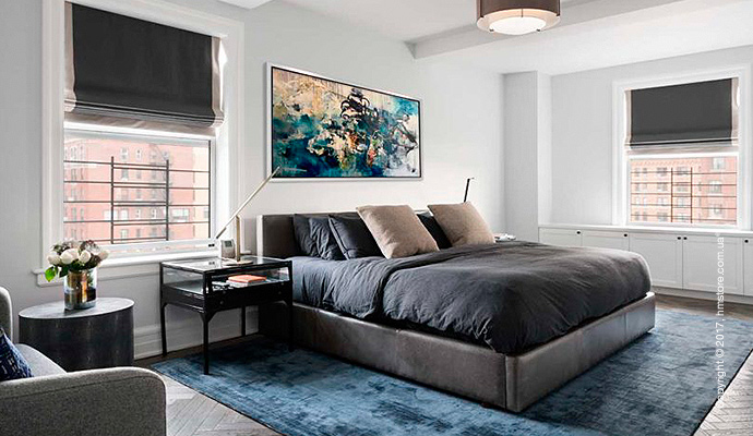 В спальнях продолжается нейтральная цветовая гамма с добавлением синих акцентов, которые можно увидеть во всех уголках квартиры.