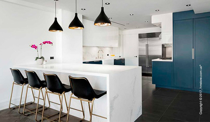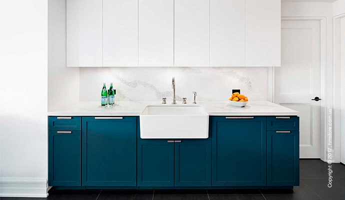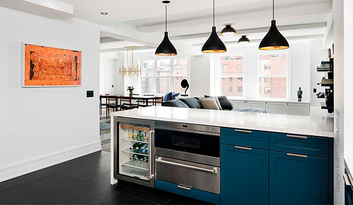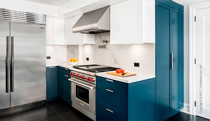 На кухне можно увидеть великолепные темно-синие нижние шкафчики и белые подвесные, которые имеют контрастные черные элементы.