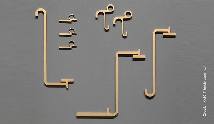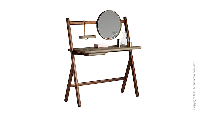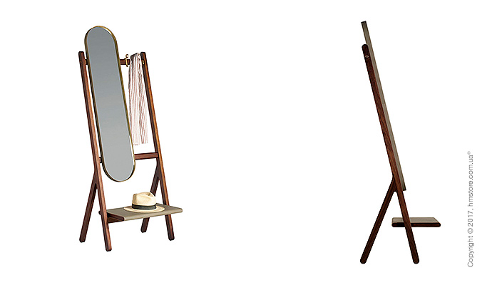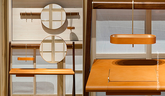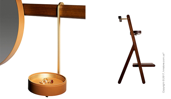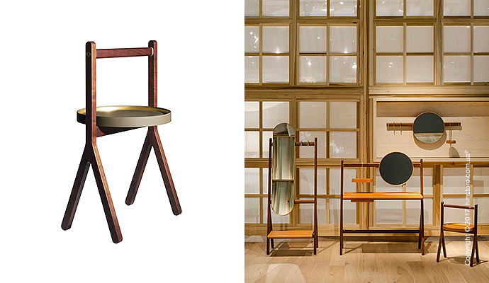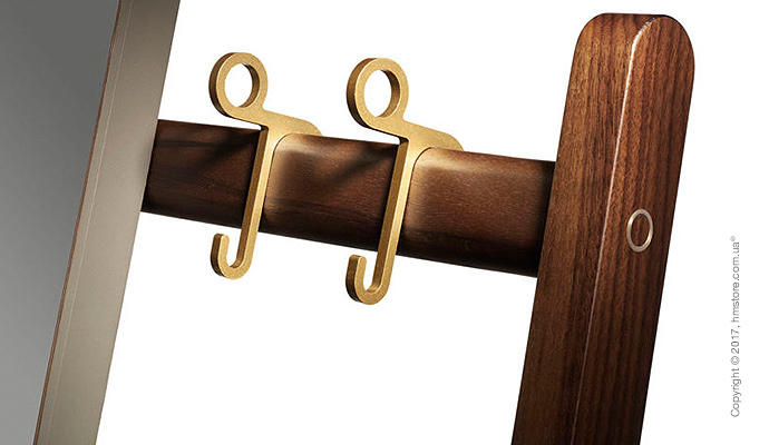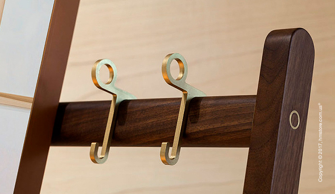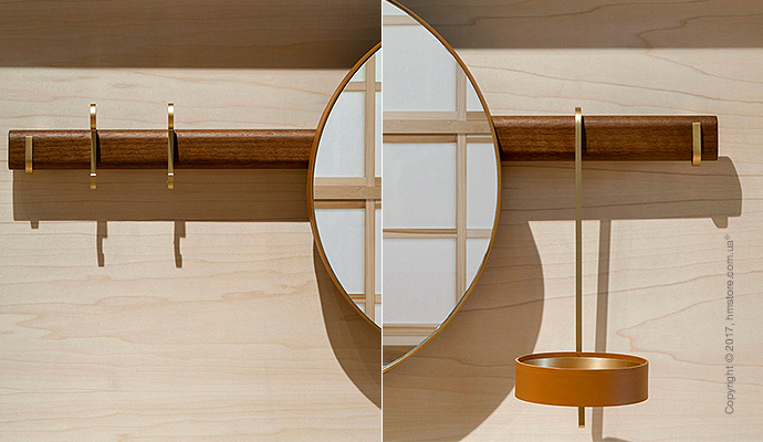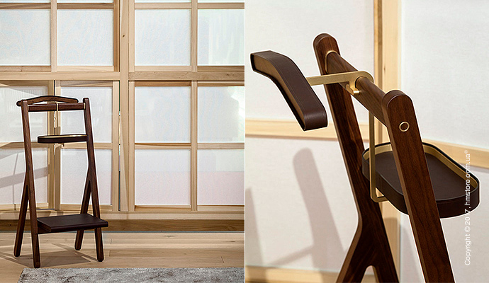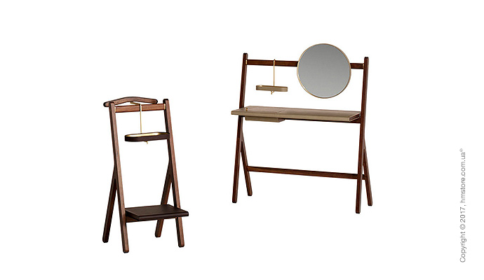 В серию входит стойка, вешалка для костюмов, вешалка для пальто с зеркалом и стол с дизайнерскими элементами из кожи и бронзы, которые дополняют богатый вид древесины.