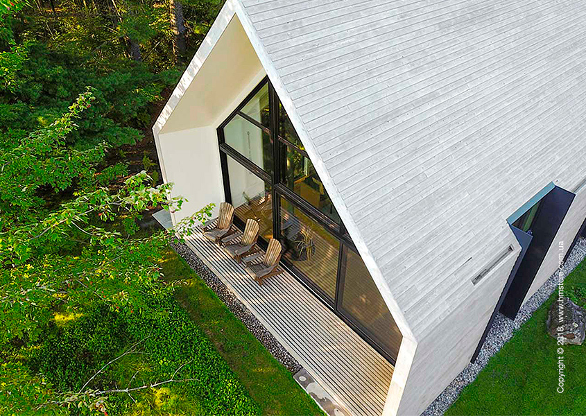 Крыша и стены дома обшиты панелями из туи, что только подчеркивает минималистичный вид коттеджа. Три высоких окна по сторонам дома наполняют его натуральным светом.