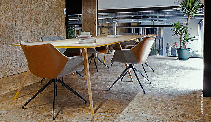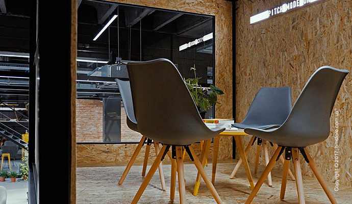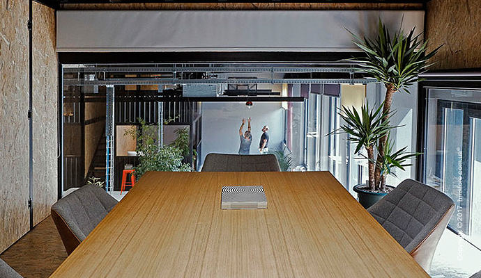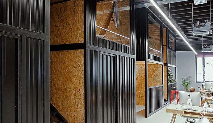Высокие потолки здания позволили им встроить «комнатки», напоминающие грузовые контейнеры, специально для закрытых встреч и мозговых штурмов. Для их создания использовалась сталь, ОСП и стекло. Из мебели здесь можно увидеть только стулья, столы и доски для записей.