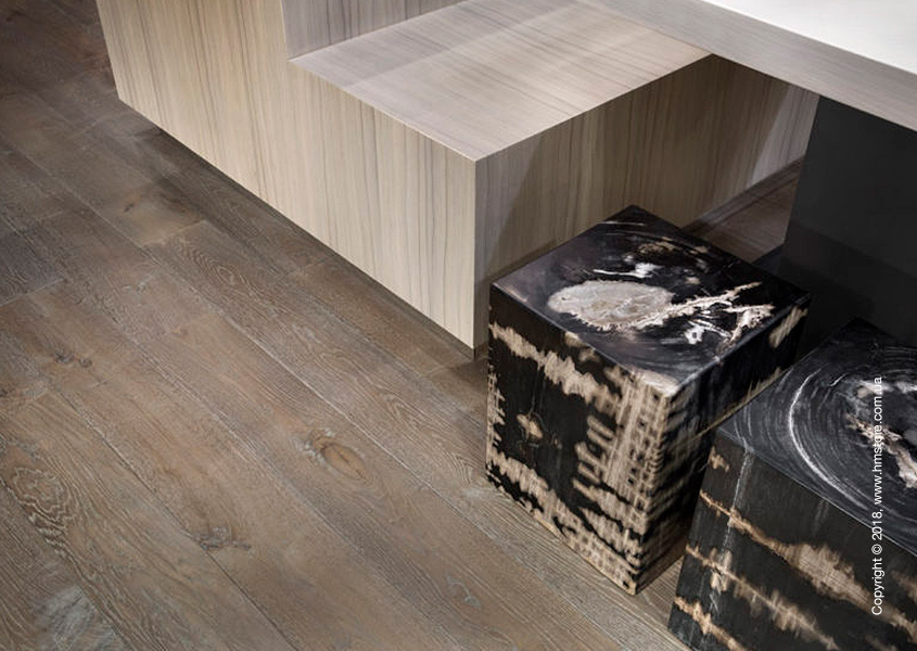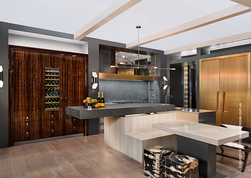Центральный остров выполнен из массивных геометрических форм, создающих многоуровневую структуру с изобилием рабочих поверхностей, а также обеденным столом. К этому столу идеально подходит скамейка, выполненная из древесины Палдао и дополненная деталями из тисненой кожи.