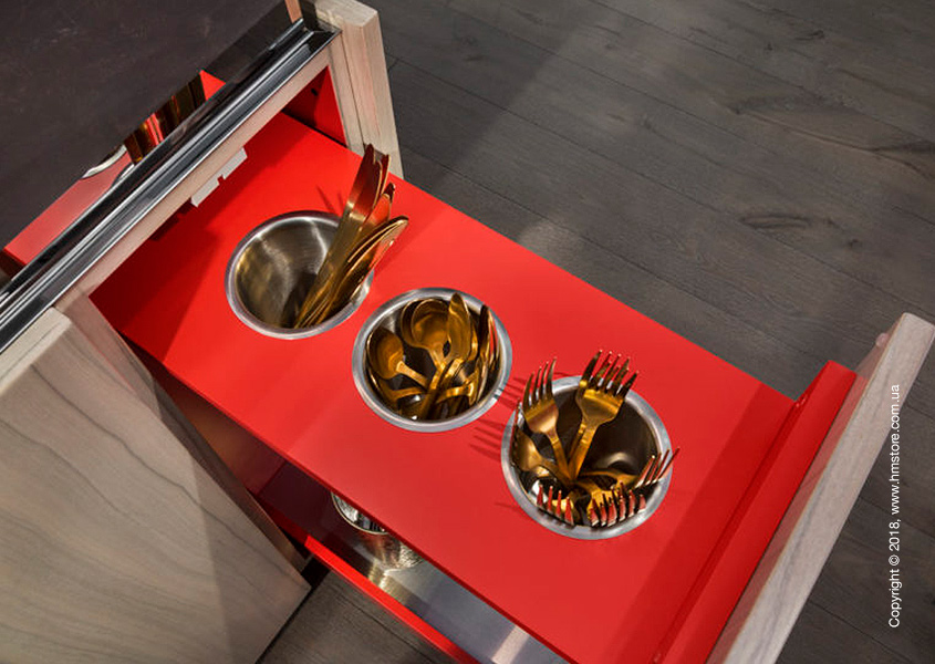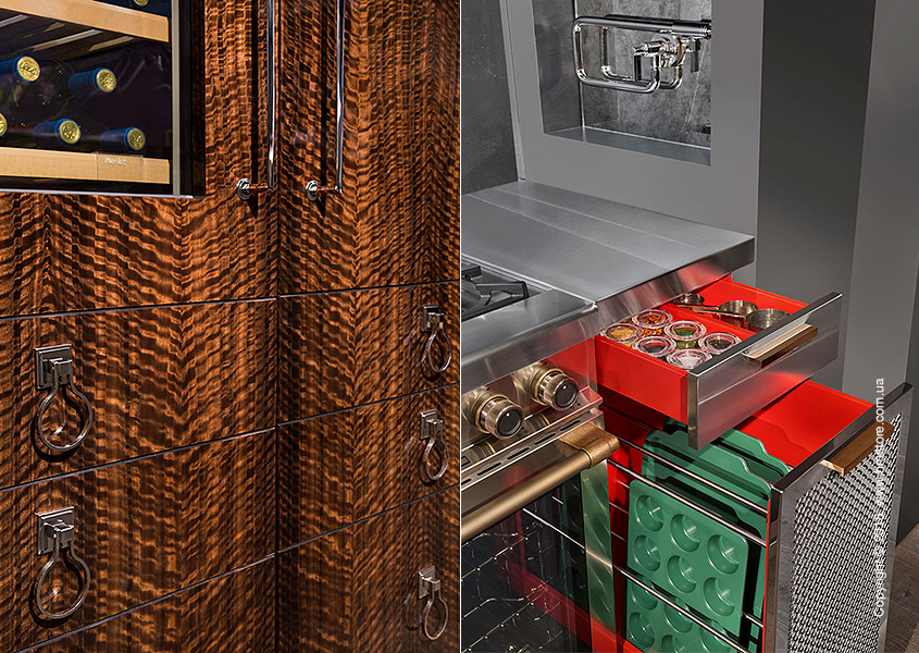 Внутри сделанные под заказ шкафчики отличаются знаменитой отделкой красного цвета от Richar Living.