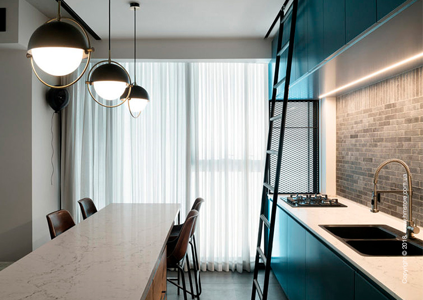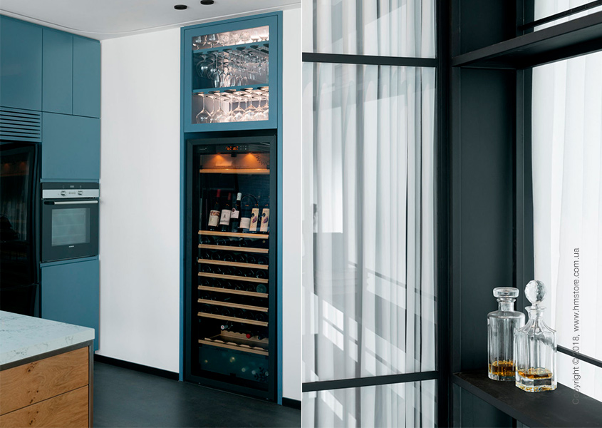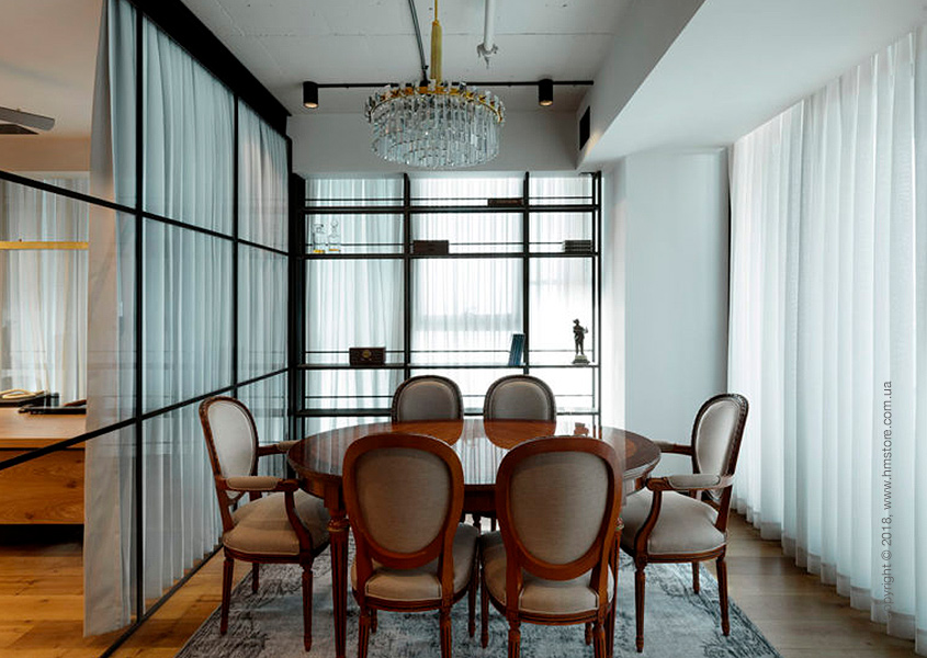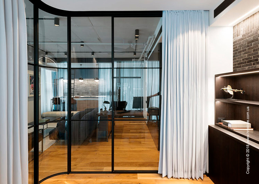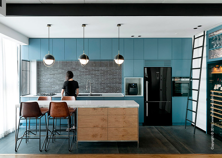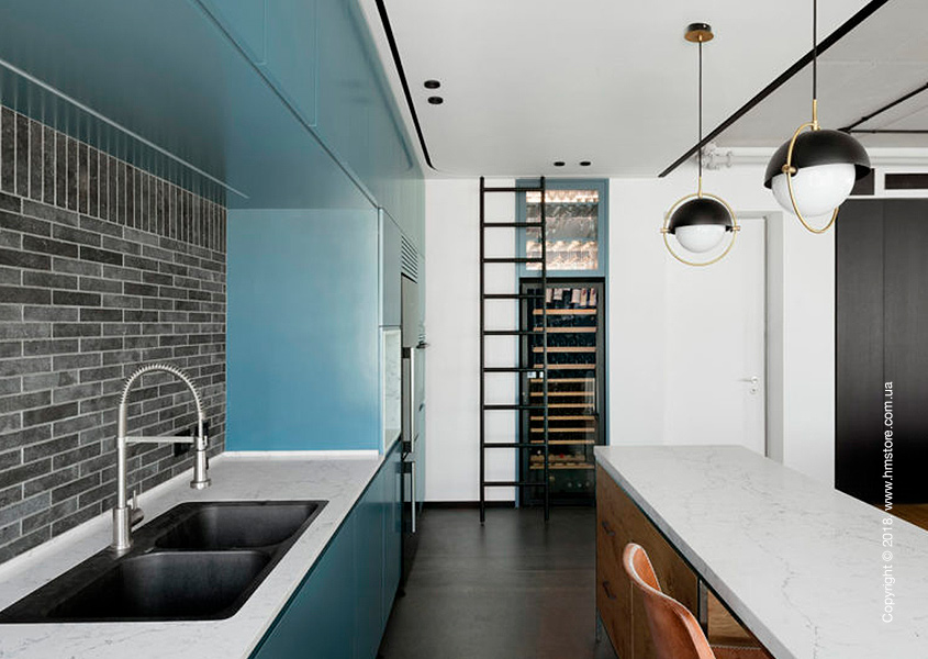 В интерьере сочетаются мягкие и уютные материалы с «сырыми» и промышленными, включая железо, стекло и необработанный лесоматериал. В целом цветовая схема в этой квартире преобладает черно-белая с синими акцентами.