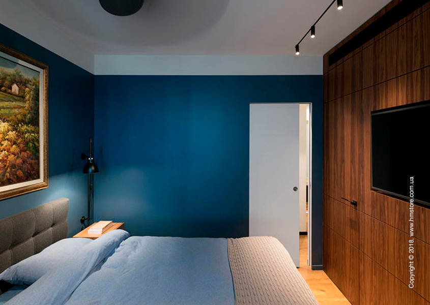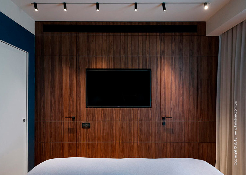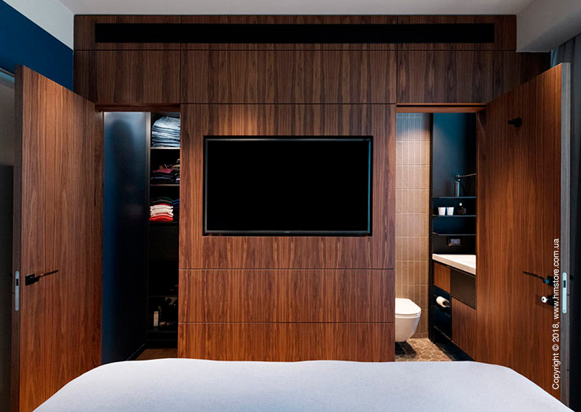 Деревянная «стена» в спальне на самом деле скрывает дверь в ванную комнату и шкаф с телевизором посередине.