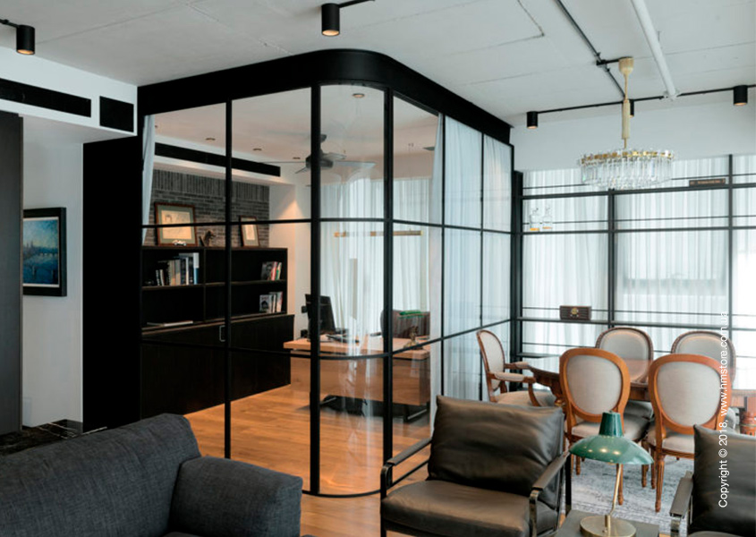 Кабинет был построен внутри комнаты, выполненной из черного железа и стекла, благодаря чему внутрь поступает достаточно света, и в то же время обеспечивается уединенность.