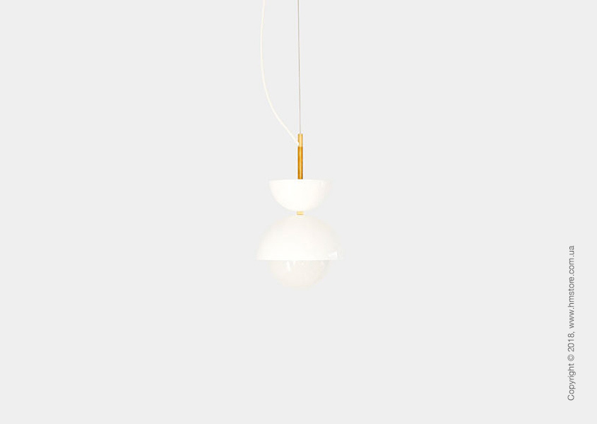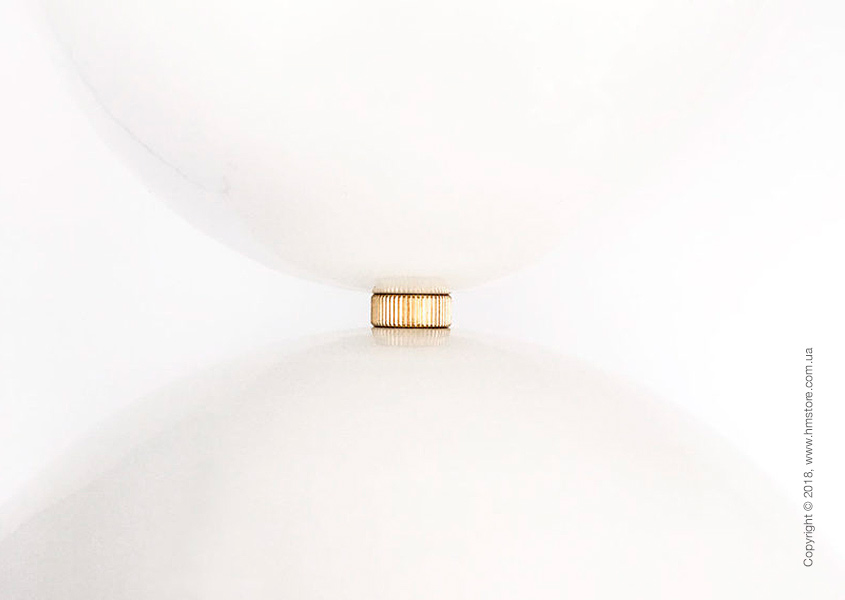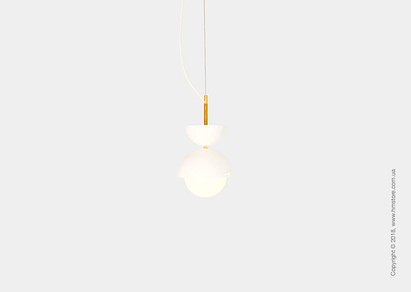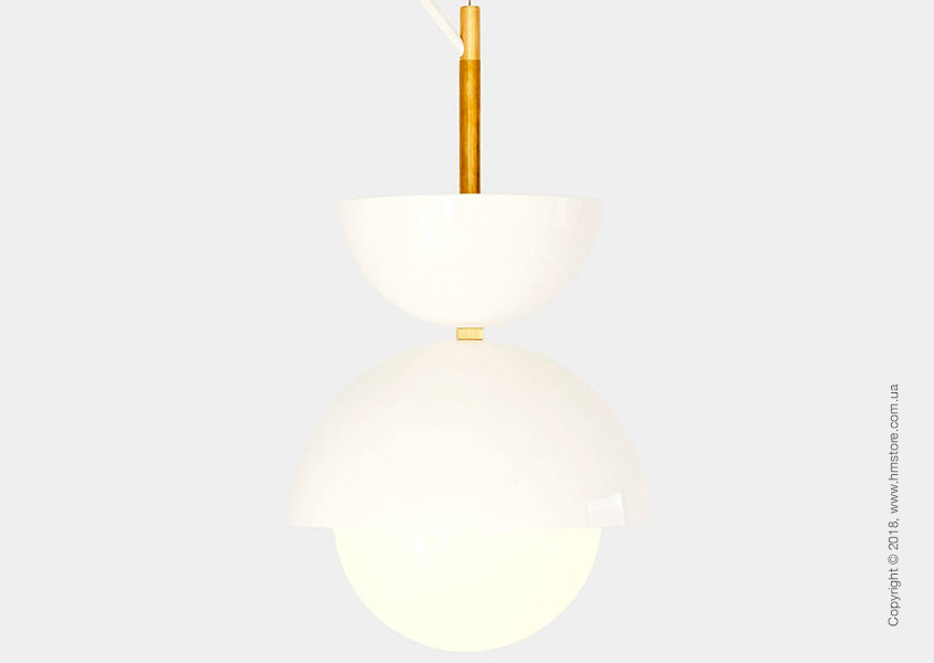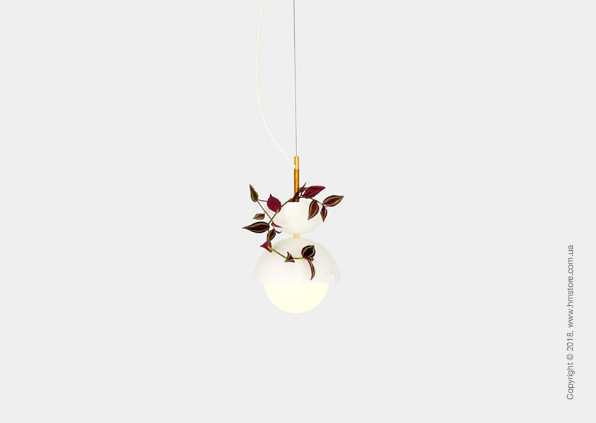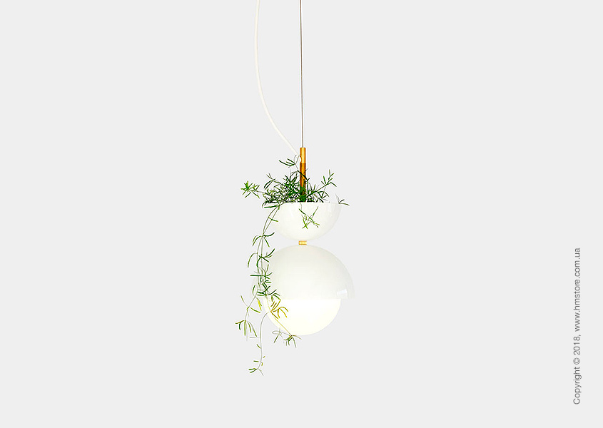 Верхняя полусфера диаметром 15 см служит горшком для растения, которое может расти и красиво свисать каскадом. Нижняя часть – это еще одна, перевернутая и бóльшая по размеру полусфера с рассеивателем из опалового стекла, который отбрасывает мягкий свет. Лампа имеет латунный стержень и такое же соединение между полусферами.