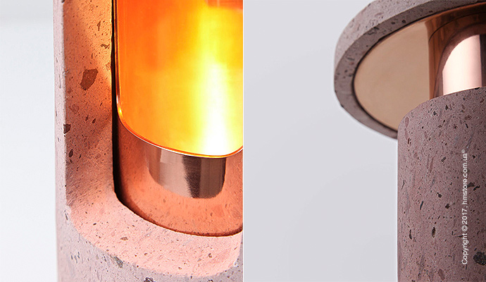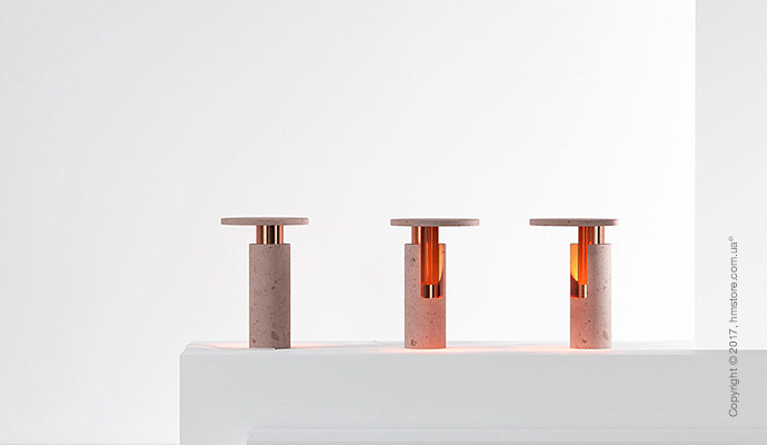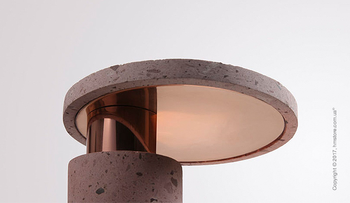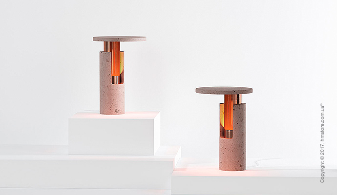Настольная лампа «Ambra Table» имеет медную цилиндрическую структуру внутри корпуса из розовой вулканической породы. Круглый каменный диск расположен на медной трубке и служит отражающим элементом для скрытой светодиодной лампы. Эта настольная лампа имеет регулируемую яркость.