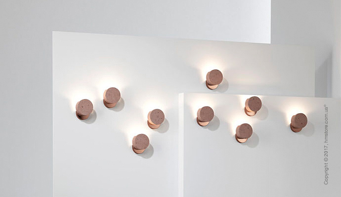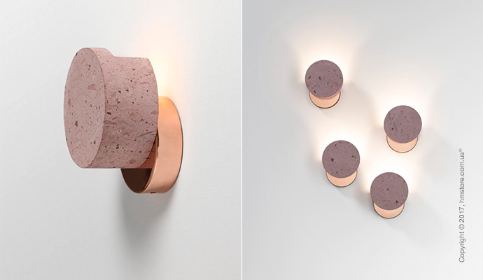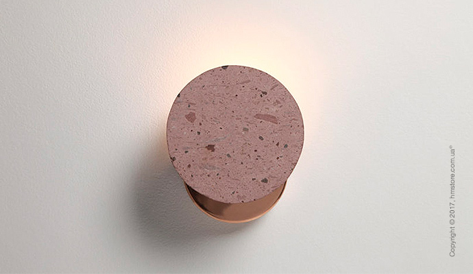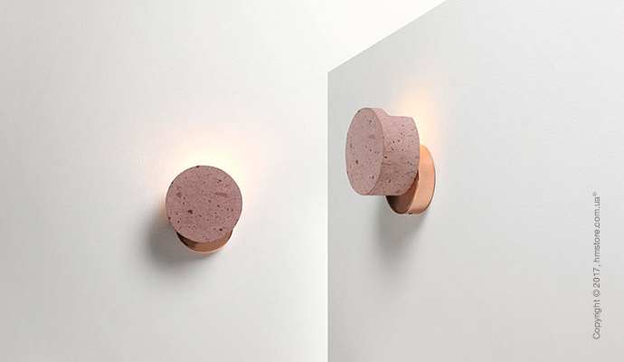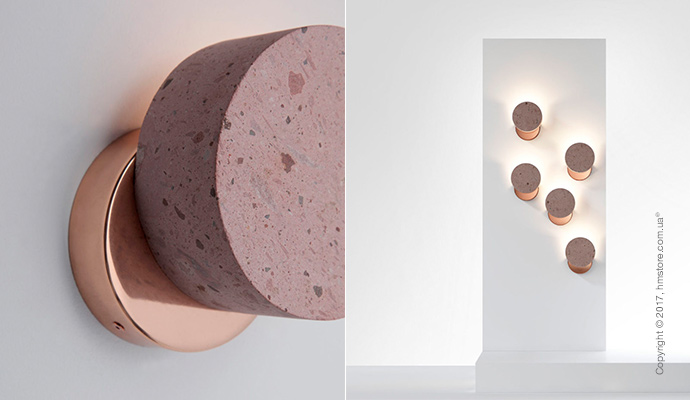 Настенная лампа «Ambra Wall» состоит из двух частей – медного основания, которое крепится к стене, и более крупного, каменного «абажура», который слегка выступает над ним.