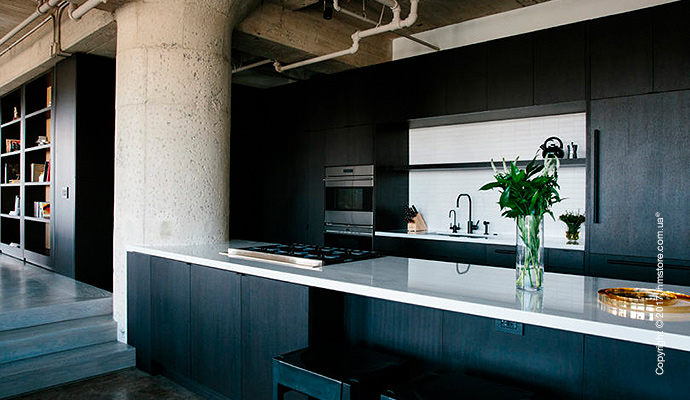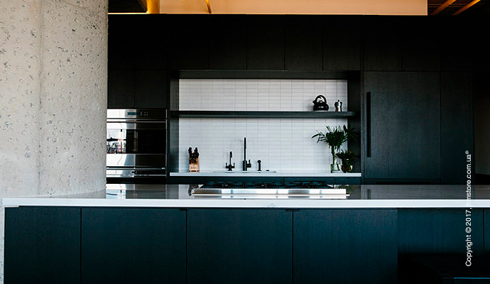 Кухня оснащена черными шкафами, которые помогли создать новую открытую планировку. Фартук за мойкой был выложен белой плиткой, которая контрастирует с общим фоном.