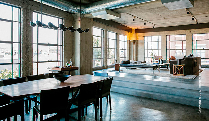 Планировка была полностью изменена путем сноса ненужных стен и создания четырех новых комнат в соответствии со стилем жизни владельца. Гостиная была приподнята на платформу, которая отличается серым дубовым полом. В остальной части лофта были оставлены оригинальные бетонные полы.