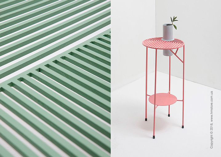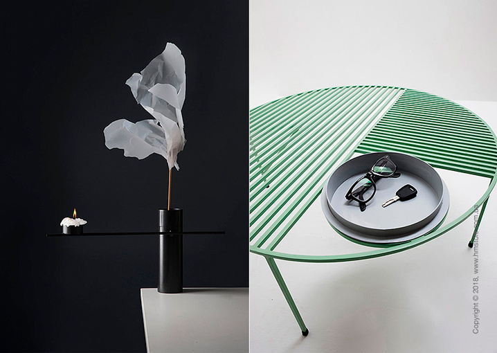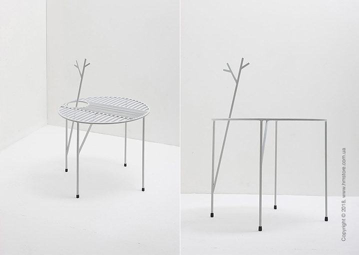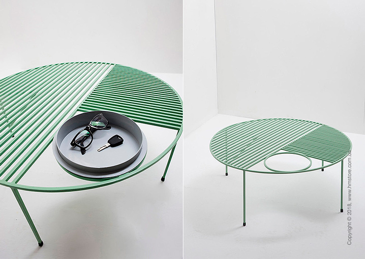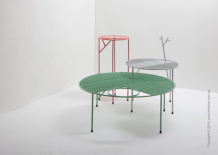 «Nontiscordardimé» – это трио красочных столиков с листовидными узорами, которые можно увидеть на графических столешницах через линии, идущие перпендикулярно друг другу. Один из столов идет с вазой для цветов или растений. Другой имеет ветку, которая растет из ножки. Ее можно использовать в качестве вешалки. Столы можно объединять разными способами, поскольку ножки легко проходят в отверстия столешниц. Вазу и поднос можно снимать.