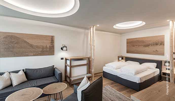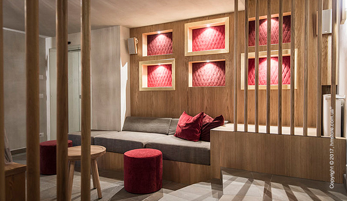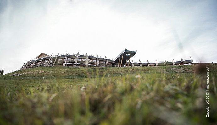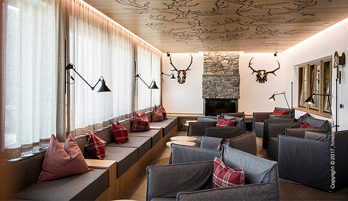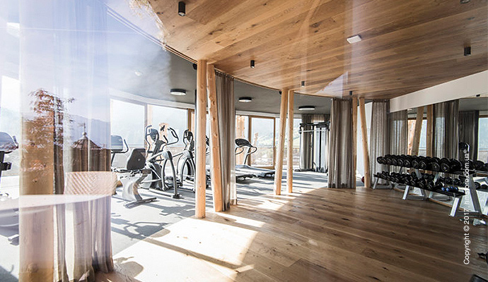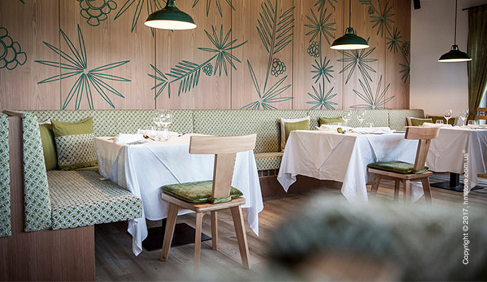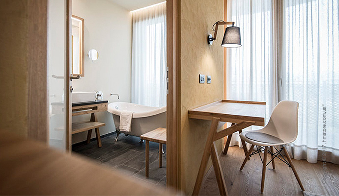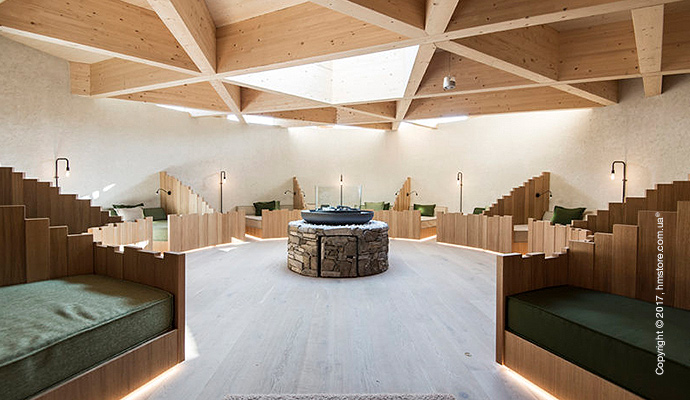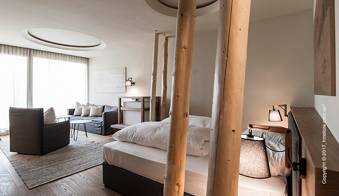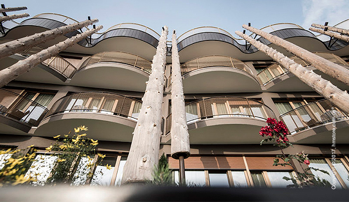 Помимо бассейна, отель «Hotel Hubertus» отличается еще и опорами в виде стволов лиственницы, которые не только поддерживают бассейн, но и создают оригинальный фасад, благодаря чему обеспечивается оригинальное сочетание старого и нового. Эти стволы визуально разделяют здание, которое повторяет топографию ландшафта, а также создают отличную тень, разделяют номера и скрывают в себе дождевые стоки.