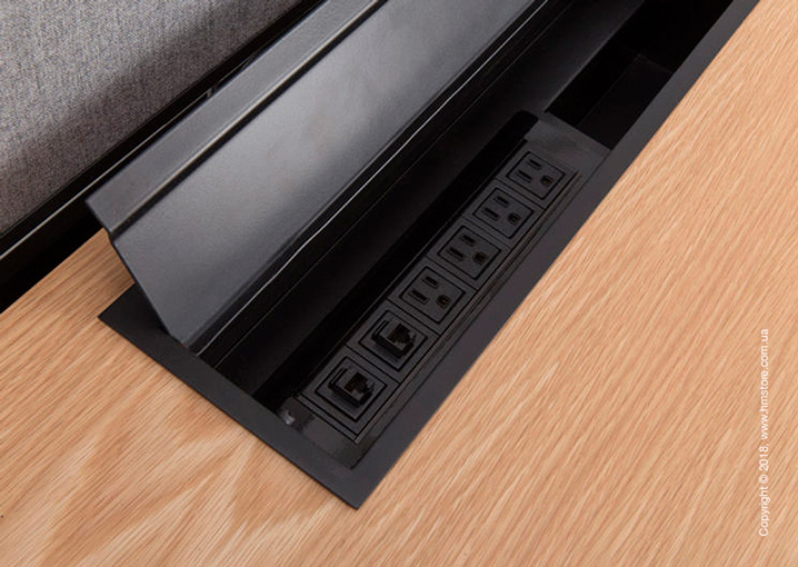 Кроме того, столешницы доступны в пяти разных видах, стальное основание – в трех отделках, а фетровая перегородка – в трех разных цветах. В завершении стоит отметить, что розетки, встроенные в стол, также можно выбирать.
