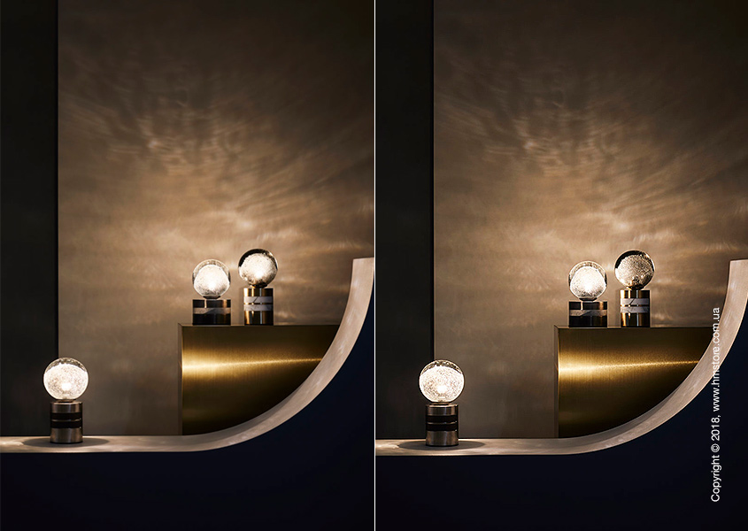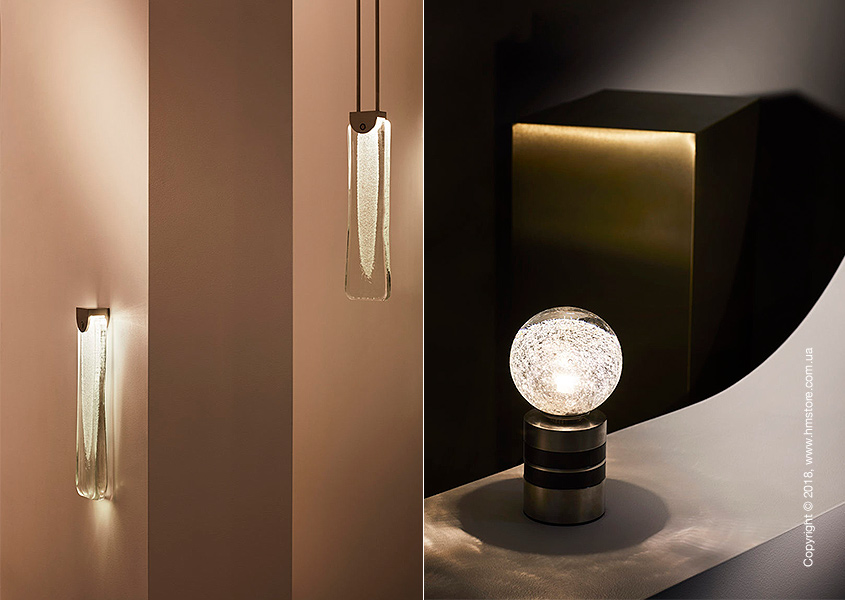 Эффект искрометных пузырьков каскадом спадает по подвесной лампе и бра, напоминая шампанское и по цвету, и по деталям. Более того, источник света тщательно скрыт, благодаря чему создается эффект драгоценного камня, который распространяет «пузырчатый» свет.