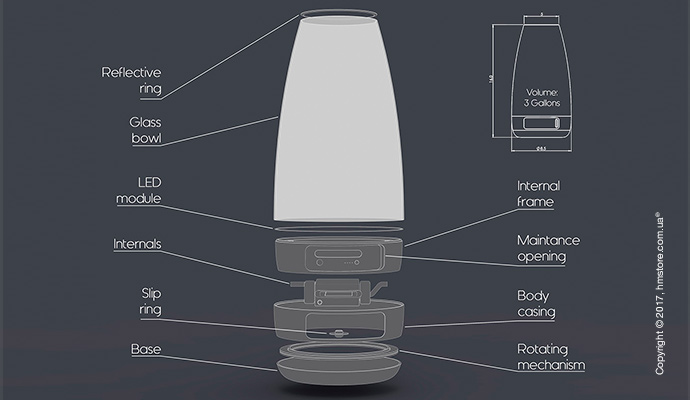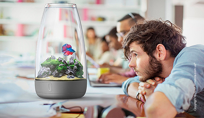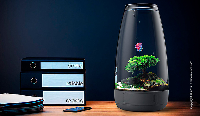 Все вышеперечисленные особенности аккуратно «упакованы» в корпус, расположенный внизу. Даже свет идет вверх от основания, а затем отражается вниз, придавая этому аквариуму утонченное, спокойное освещение, вместо привычного направленного и слишком яркого. Самое крутое в этом аквариуме то, что он может автоматически вращаться на 360°. Это происходит очень медленно, благодаря чему вы можете наслаждаться успокаивающим, постоянно меняющимся «морским» видом.